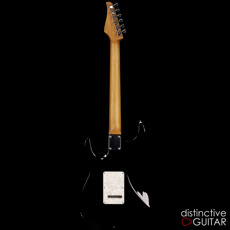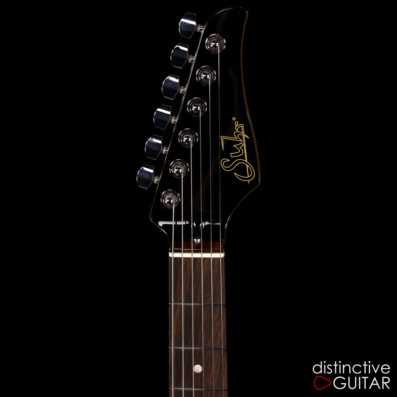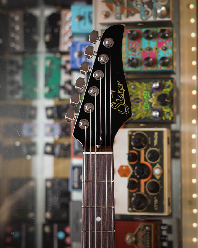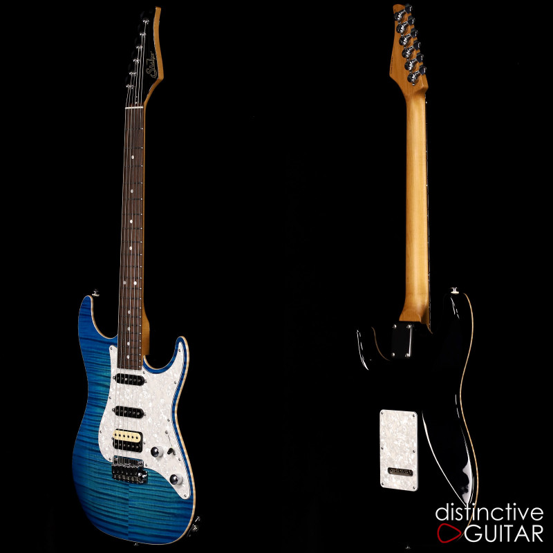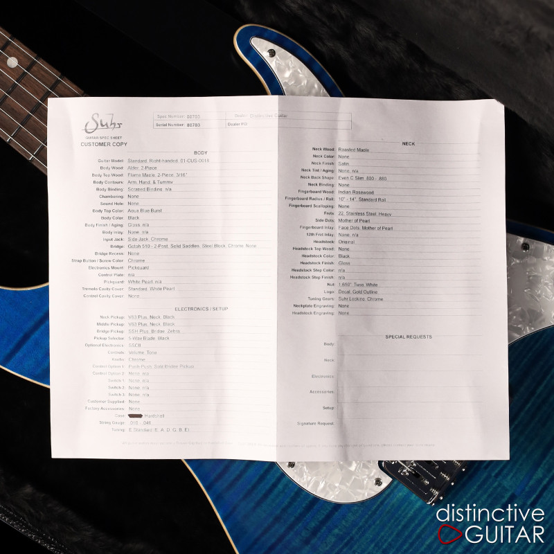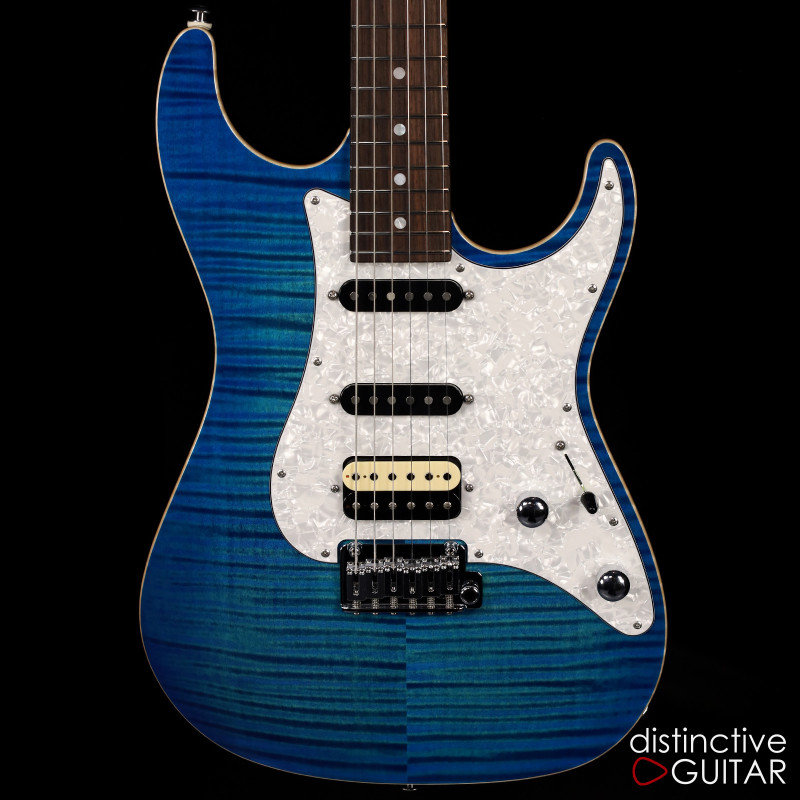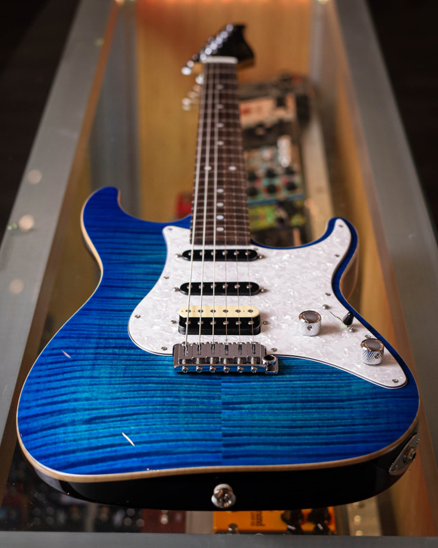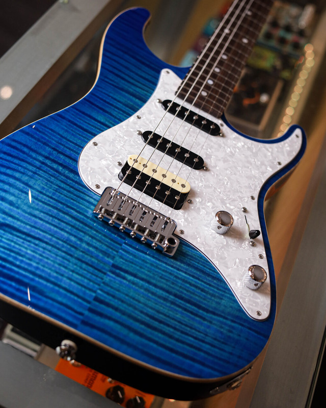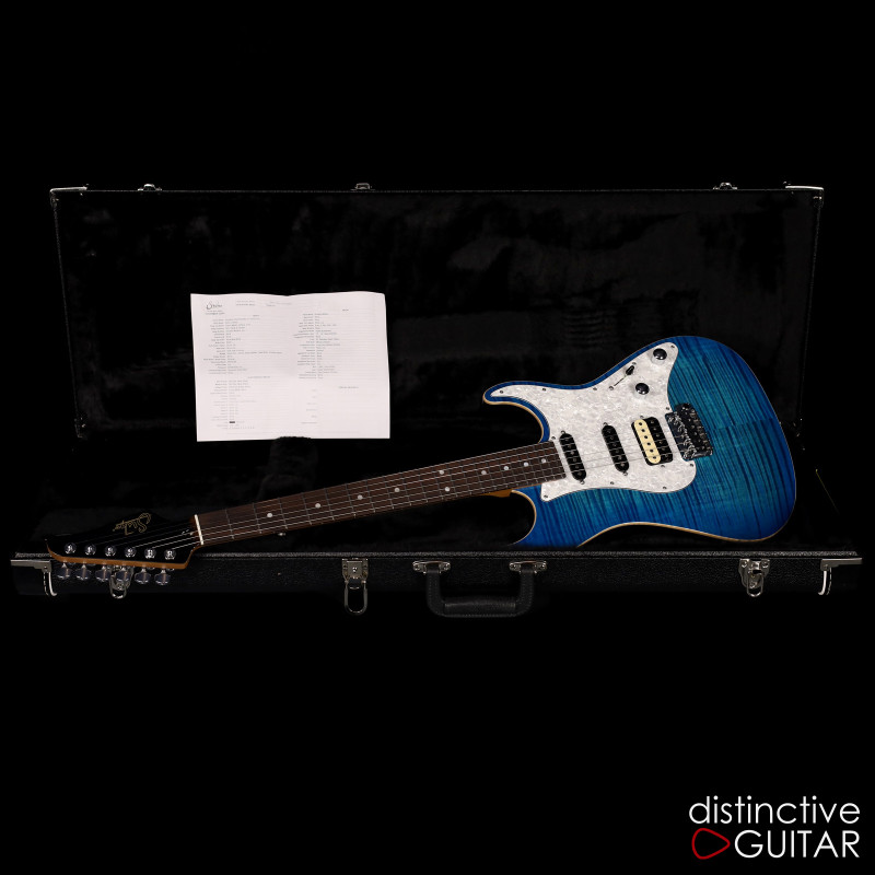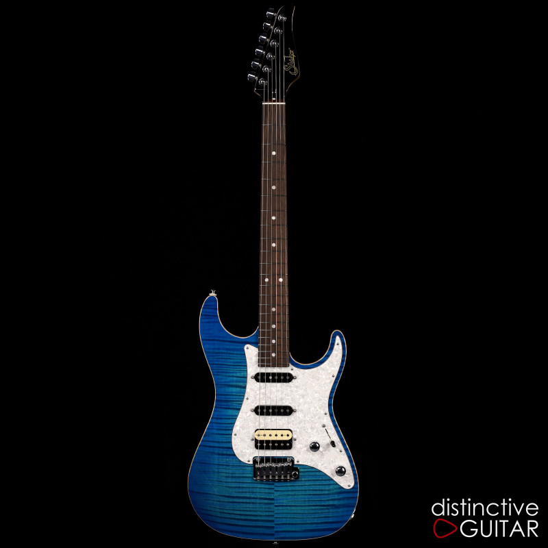 Suhr Standard Custom in Aqua Blue Burst with a stunning Flame Maple Top and black headstock! This Standard takes versatility to the next level. A SSH+ in the brigdge plus a pair of V63 single coils. The 5 way and push/push split opens up a wide range of tonal options. The SSCII system keeps those single coils nice and quite, it's perfect for a gigging guitarits.